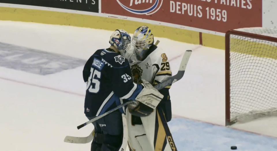 Le jeune gardien de 17 ans est allé réconforter son vis-à-vis des Cataractes de Shawinigan, Mathys Fernandez, qui venait de céder sur un 23e lancer dans la prolongation durant laquelle il a volé la vedette. Celui qui a récemment eu 20 ans est demeuré un long moment étendu sur la glace après le but vainqueur de Maël Lavigne. L’Océanic a gagné le match 3-2 et mène la série 3-2.