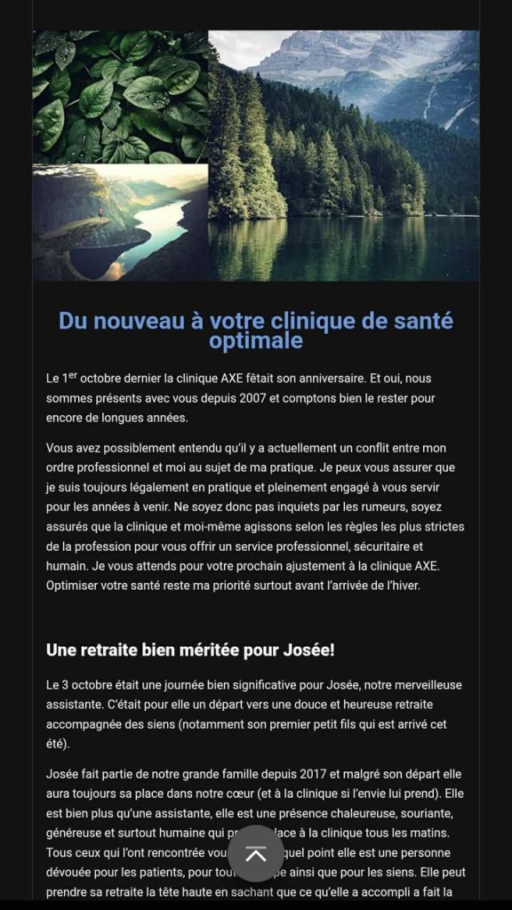 Dans l’infolettre de sa clinique Axe Chiropratique d’Amqui, celui-ci écrit qu’il est « toujours légalement en pratique » et indique que sa radiation n’est qu’une « rumeur ».