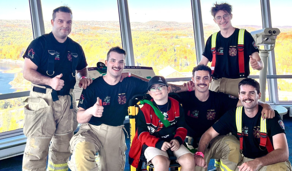 Comme si monter la tour de la Cité de l’énergie deux fois n’était pas assez, les pompiers de Sainte-Félicité ont aussi relevé le défi des héros qui consistait à monter dans la tour avec un jeune homme en chaise roulante.
