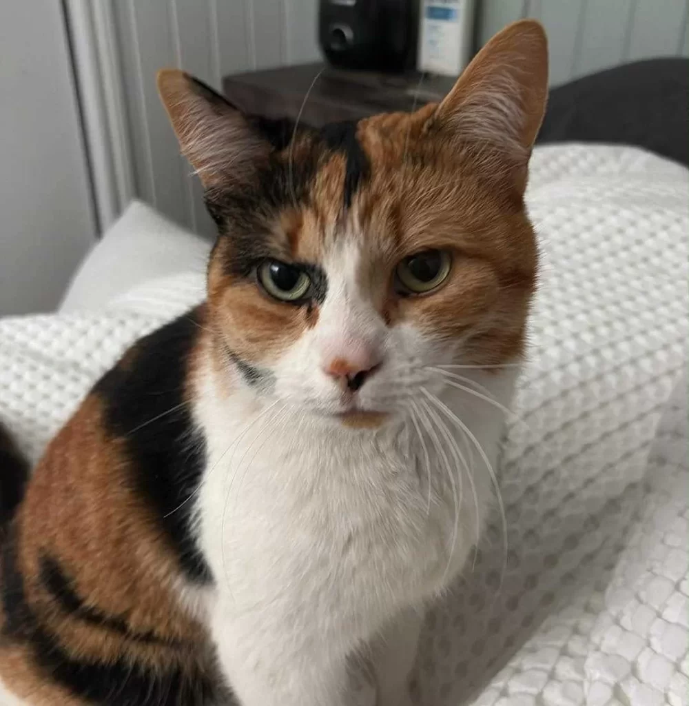 « Depuis le début de l’été, je voyais souvent une petite chatte à trois couleurs se promener dans le voisinage à Petit-Matane. Plus le temps filait, plus on la voyait proche de la maison. J’ai donc laissé un peu de nourriture sur le perron, pensant qu’elle avait peut-être faim. J’ai remarqué que le bol se vidait rapidement, donc j’en remettais encore plus et elle mangeait tout chaque fois. »