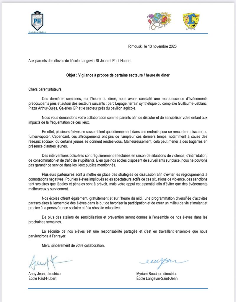 Les directions des écoles Saint-Jean, Langevin et Paul-Hubert de Rimouski lancent un appel à la vigilance dans une lettre envoyée aux parents et dont Le Soir.ca a obtenu copie. Elles ont constaté une recrudescence d’événements préoccupants sur l’heure du dîner.