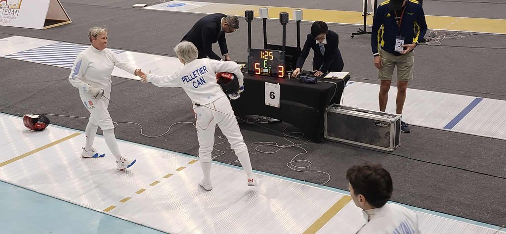 Pour sa part, Lise Pelletier, dans la catégorie 60 ans et plus, a pris part à trois compétitions. Au sabre, elle a gagné ses deux matchs de qualification avant de s’incliner dans le tableau des 16 pour terminer en 17ᵉ position.