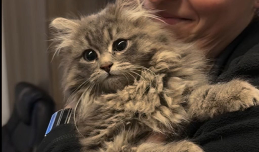 « Il a passé la nuit dans nos locaux. C’est un beau petit chaton d’environ deux ou trois mois, selon moi. Il est très affectueux ce matin. C’est une belle histoire. »