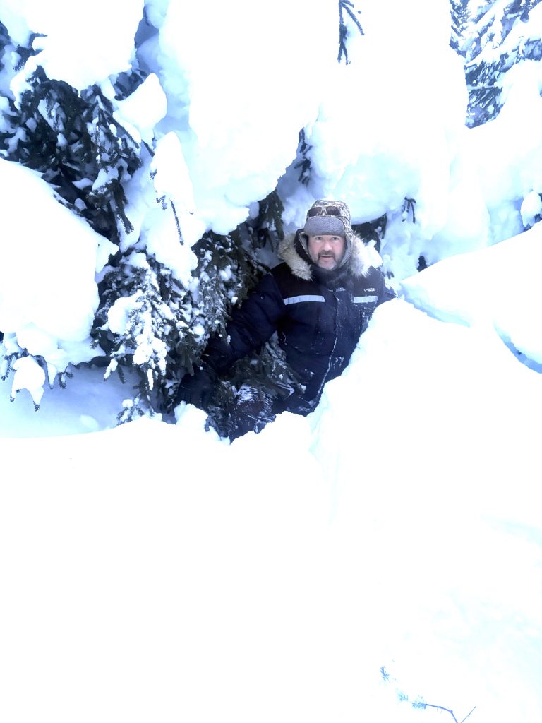 À l’aide d’un de bout de bois, Guillaume Ouellet mesure l’épaisseur de la neige en forêt, où le cerf se déplace aisément sur une neige durcie. (Photo courtoisie Guillaume Ouellet)