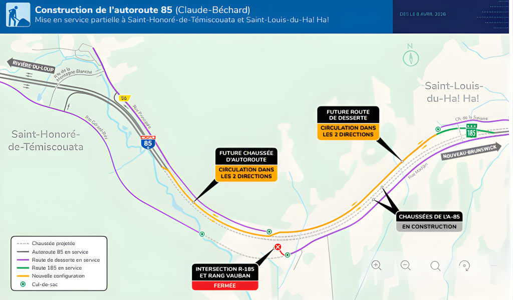 Le ministère des Transports et de la Mobilité durable procédera, le 8 avril, à la mise en service d’un chemin de déviation temporaire, dans le cadre de la construction de l’autoroute 85 (Claude-Béchard), à Saint-Honoré-de-Témiscouata et à Saint-Louis-du-Ha! Ha!.