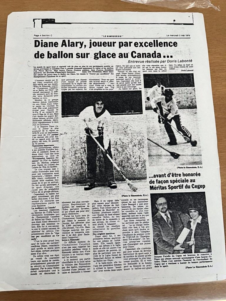 Pendant une vingtaine d’années, Diane Alary a dominé dans ce sport qui connaissait alors ses lettres de noblesse dans la région avec plusieurs ligues, autant chez les adultes que les plus jeunes, en plus d’importants tournois. Chez les garçons et chez les filles, le ballon sur glace a produit des équipes championnes et des athlètes de haut niveau.