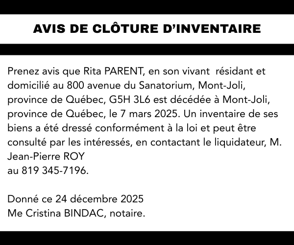 Avis de clôture d’inventaire – Succession Rita Parent