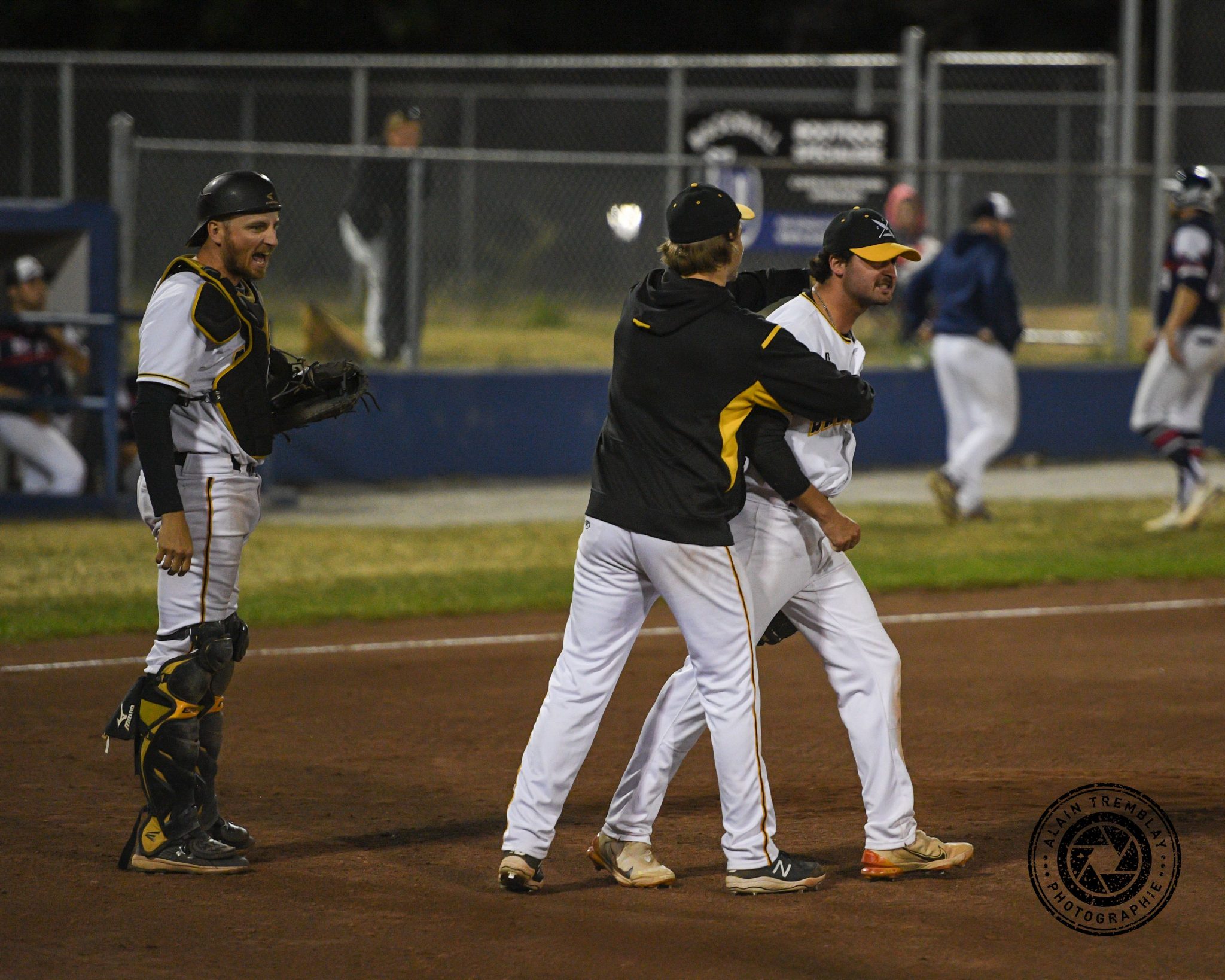 Émile Maisonneuve manifeste sa joie après le dernier retrait. Il est félicité par Benjamin Roy. (Photo : Alain Tremblay)