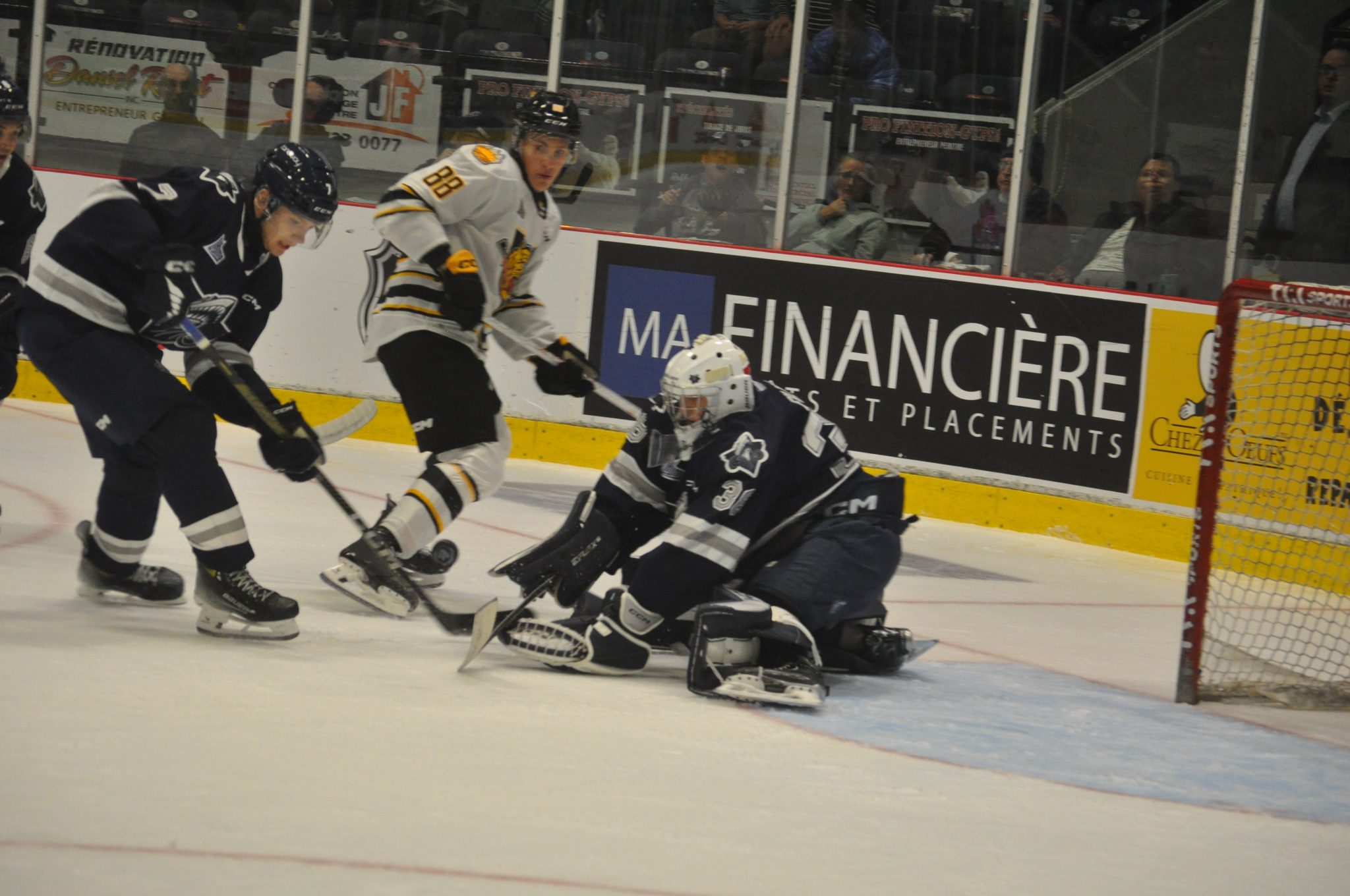 Nikita Prishchepov frappe à la porte du gardien Vincent Filion dans le match inaugural de la saison à Rimouski. (Océanic / Folio Photo – Iften Redjah)