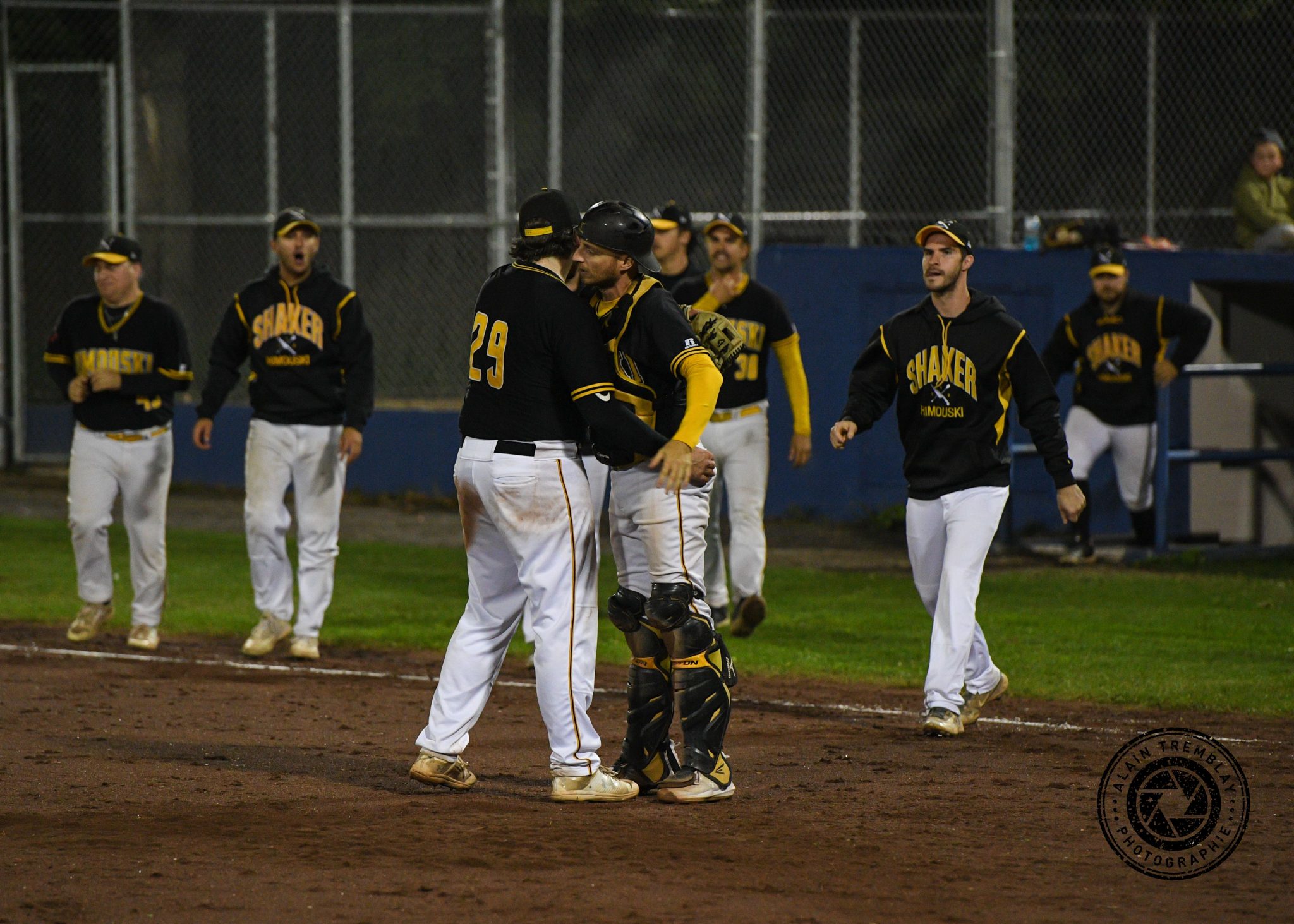 C’est la victoire pour le Shaker qui est de retour dans la série. Jean-Philippe Marcoux-Tortillet est félicité par son receveur, Maxime Lévesque. (Photo : Alain Tremblay)